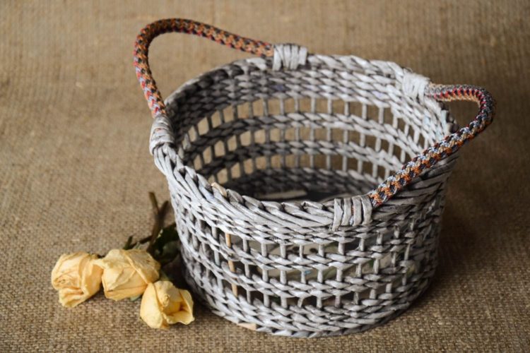 Keranjang mungil dari kertas korang bekas ini juga menarik, bukan? Caranya hampir sama dengan cara membuat keranjang serbaguna, tetapi alasnya dibuat dari tripleks berbentuk lingaran. Anyaman keranjang bungan ini juga dibuat tidak terlalu rapat.
